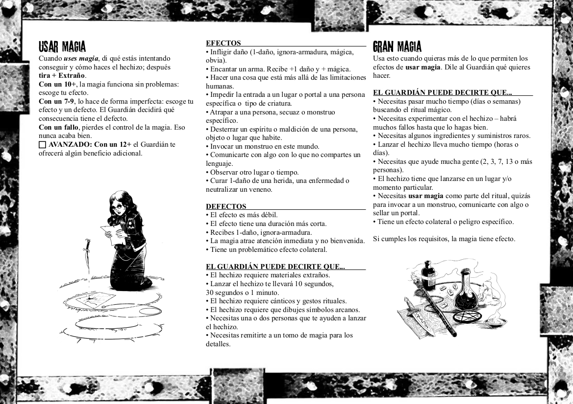 También tenemos las hojas de referencia para los Cazadores y el Guardián, que incluyen todos los movimientos de Extraño hasta la fecha y versiones para que uses la que más te encaje: https://fangtastic-worlds.itch.io/monster-of-the-week-hojas-de-referencia
